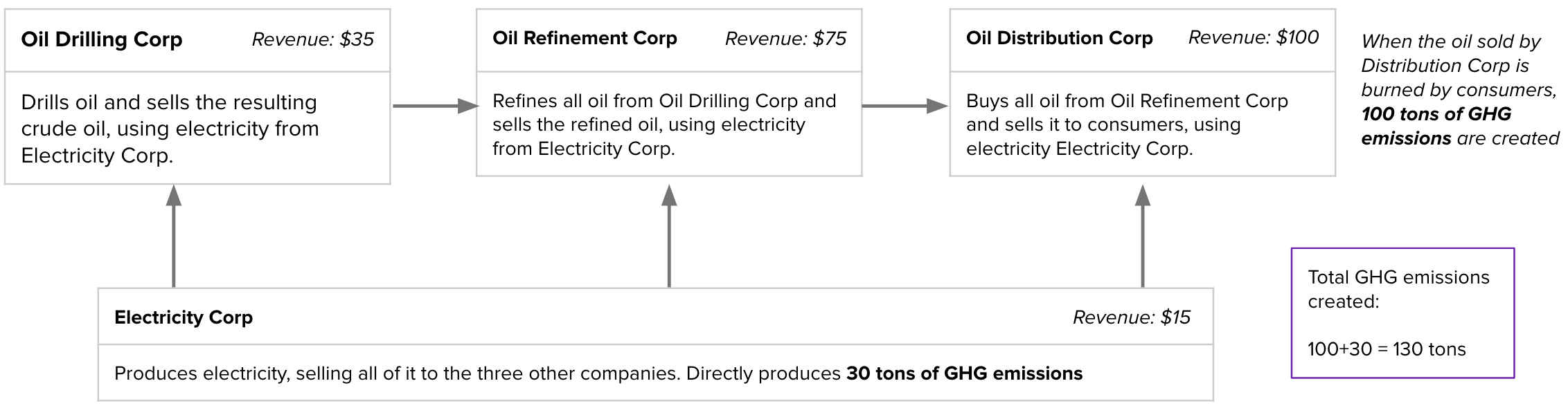 To keep the example simple, the only company producing direct emissions is <mark style="background-color:yellow;">Electricity Corp</mark>, which produces 30 tons of GHG emissions. Additionally, end users burning the oil they purchase from <mark style="background-color:yellow;">Oil Distribution Corp</mark> create 100 tons of GHG emissions when that oil is burned.